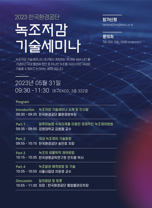 대응하기 위한 방안을 모색한다. 이 세미나는 알루미늄 수처리제를 이용한 경제적인 녹조제어방법(김범철 강원대 교수), 국내 녹조제어 기술동향(송민호 K-eco 한국환경공단 차장), 녹조의 생물학적 제어방법(안치용 한국생명공학연구원 박사), 녹조발생 예측방법 및 기술(차윤경 서울시립대 교수)이 소개될 예정이다.
