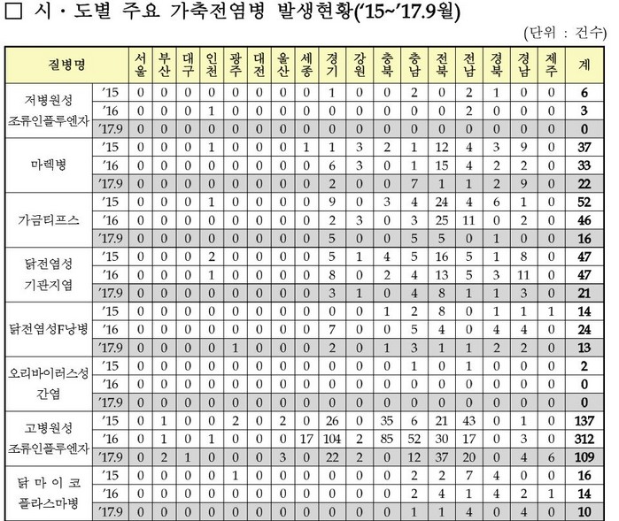 올해 경기도가 밝힌 AI 특별방역기간(17.10월~18.5월)운영을 보면, 차단방역 강화 및 취약지역 등 점검 교육 강화는 하나의 행정 편의적인 것이 지나지 않고 있다. 경기도 내 5만수이상 산란계농장은 모두 106곳에 달한다.