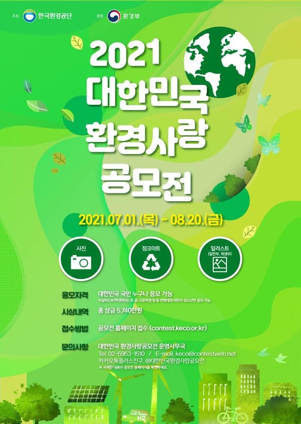 K-eco 한국환경공단은 '2021 대한민국 환경사랑공모전'을 개최하고, 7월 1일부터 8월 20일까지 작품을 접수한다.