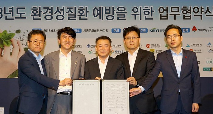 한국환경산업기술원(원장 남광희)은 8일 세종문화회관에서 사회공헌기업, 지자체와 함께 '취약계층·어르신 활동공간 환경성질환 예방사업'을 위한 업무협약을 체결했다.