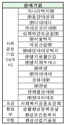 개선사업에 참여하는 사회공헌기업은 개나리벽지, 코웨이 등 총 16개사다. 이들 기업은 주거환경 개선을 위해 벽지, 장판, 페인트 등의 친환경 인테리어 자재, 가구, 생활용품, 공기청정기 등 물품을 기부한다.