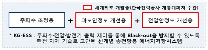 KG-ESS는 전력계통의 안정도를 개선하는 계통안정화용 ESS를 의미하며, 계통주파수조정을 위해 기 설치된 ESS를 포함해 지금 한전에서 세계최초로 개발 중인 과도안정도와 전압안정도 개선용 ESS를 총칭해서 말한다.