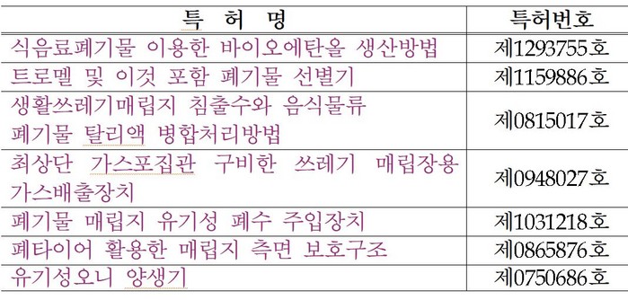 공개대상특허는 ▲식음료폐기물 이용 바이오에탄올 생산방법 ▲생활쓰레기매립지 침출수와 음식물류 폐기물 탈리액의 병합처리방법 등 자원순환분야 및 친환경매립장 운영 노하우 관련 기술로, 특허정보넷 키프리스 누리집(www.link.kipris.or.kr)에서 내용을 확인할 수 있다.