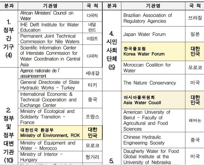 2018년 12월에 이사기관으로 선출된 환경부 등 3개 기관은 5개 분과(College)로 이뤄진 이사기관 선거에서 환경부는 정부 및 정부 이해관계 대변기관(College-2)으로, 한국물포럼은 시민사회단체(College-4)로, 아시아물위원회는 전문가 및 연구ㆍ학계(College-5)로 다시 선출됐다.