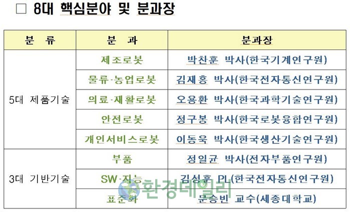 8개 분과는 제조, 물류·농업, 의료·재활, 안전, 개인서비스, 부품, SW·지능, 표준화 등이다.