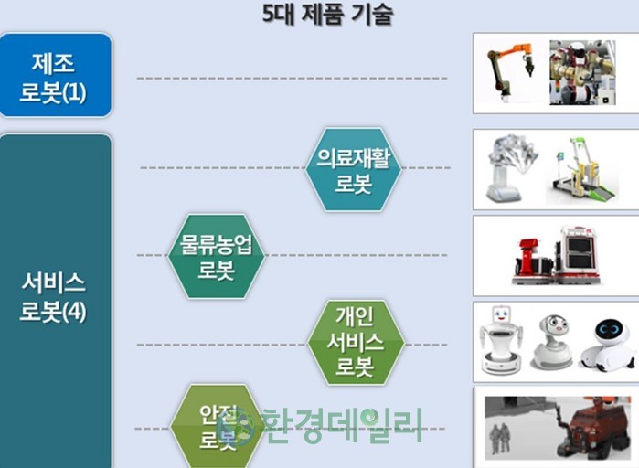 제품기술 중 국내 로봇시장에서 가장 큰 비중(61%)을 차지하는 '제조로봇'분야에서 협동로봇· 조립공정용 로봇 중심으로 개발 목표 및 기술 확보 방안을 도출했다. 협동로봇 관련 로봇 단품 자체로 안전 구현이 가능한 로봇 안전 기술, 인간 작업자의 조립능력과 유사한 수준의 조립공정용 로봇 기술이다.