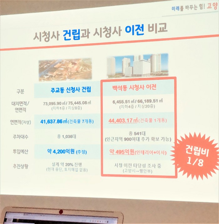 이정형 부시장은 시청사 건립과 이전을 비교표를 들며 청사 면적, 주차대수, 투입예산 등에서 주차장만 빼놓고 백석동 시청사 이전에 가장 효율적이다고 주장했다.