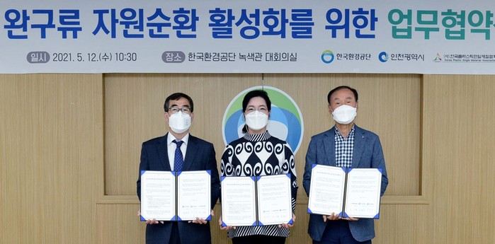 | ▲한국환경공단은 12일 공단 대회의실에서 완구류 자원순환 여건개선 시범사업 실시 업무협약을 맺었다. (사진 왼쪽부터) 인천시 유훈수 환경국장, 한국환경공단 김은숙 자원순환본부장, (사)한국플라스틱단일재질협회 구제봉 회장이 기념촬영을 찍고 있다. |
