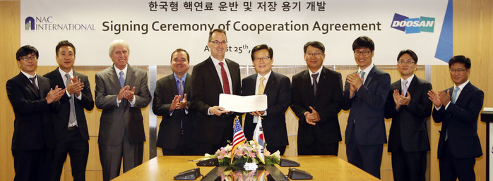 [환경데일리 이은수 기자] 두산중공업(대표이사 부회장 박지원)은 25일 서울사무소에서, 미 NAC사 캔트 콜(Kent Cole) 사장과 두산중공업 원자력 BG 김하방 부사장 등 양사 관계자들이 참석한 가운데 한국형 사용후핵연료 저장 용기(CASK) 공동 개발을 위한 협약을 체결했다.