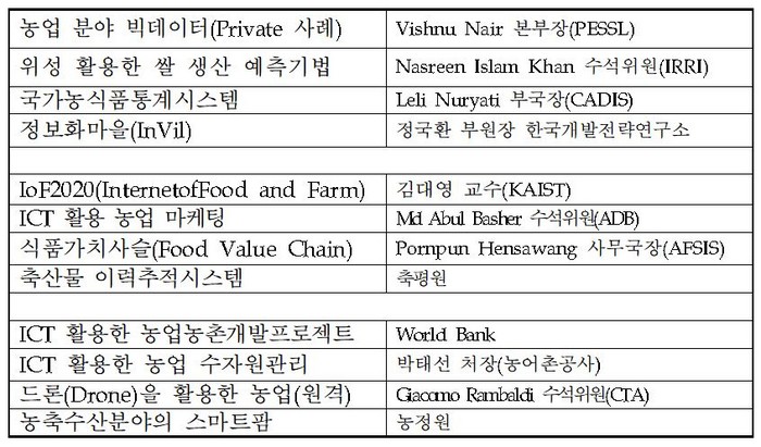 세계은행(World Bank), 아시아개발은행(ADB), 국제미작연구소(IRRI), ACP-EU농업농촌개발협력센터(CTA), 아세안식량안보정보시스템(AFSIS) 등 해외와 국내 전문가들이 함께 참석, 각 기관 별 프로젝트 사례를 공유하고, 마지막에 지속가능한 농업 ICT 융복합 분야 발전을 위한 토론으로 진행되며, 관심 있는 사람은 누구나 참석할 수 있다.