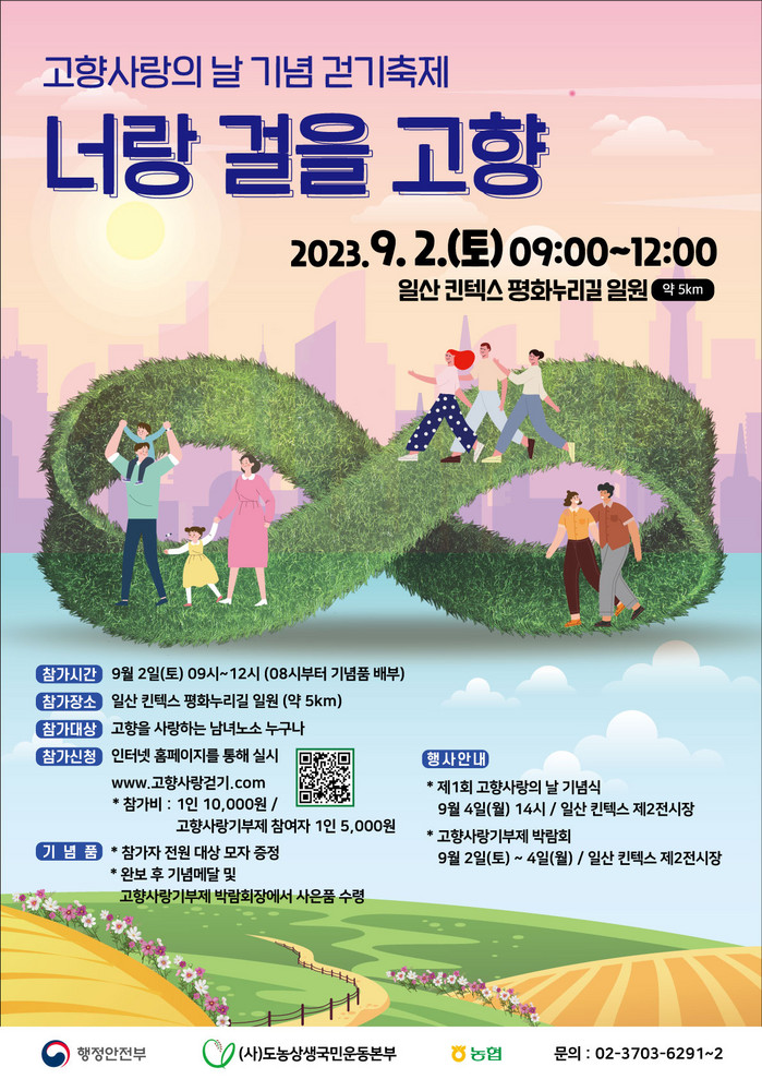 (사)도농상생국민운동본부는 올해 처음 국가기념일로 지정된 '고향사랑의 날'이 고향의 가치와 소중함을 다시 돌아보는 축제의 장으로 거듭나길 바라는 취지로 '너랑 걸을 고향 걷기'축제를 고향사랑기부제 박람회 개막일인 9월 2일에 킨텍스 평화누리길 일원에서 진행한다.