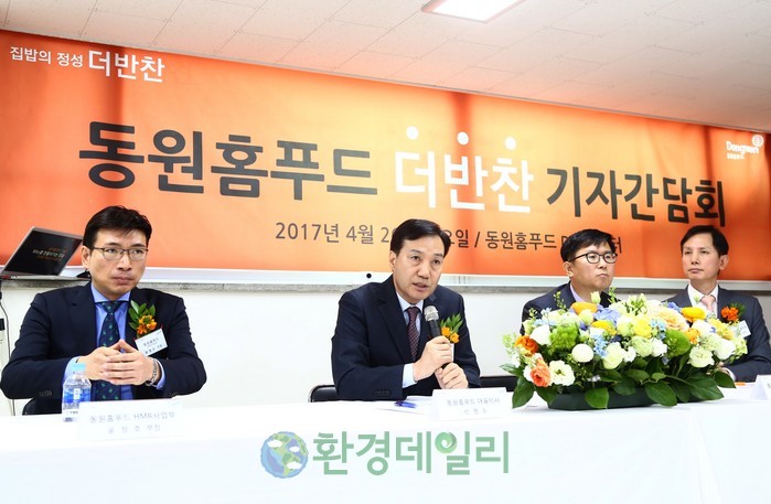 | ▲서울 가산동에 위치한 동원홈푸드 더반찬 서울신공장 DSCK센터 오픈 기자간담회에서 신영수 대표가 발언을 하고 있다. 좌측부터 윤정호 동원홈푸드 HMR사업부장, 신영수 동원홈푸드 대표이사, 조영부 동원홈푸드 경영지원실장, 서정동 동원그룹 홍보실장 |