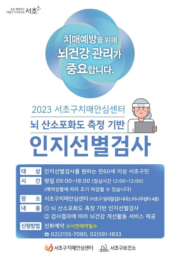 뇌 산소포화도 측정 기반 인지선별검사 사전 예약 및 문의는 서초구 치매안심센터(☎02-2155-7080)로 하면 된다.