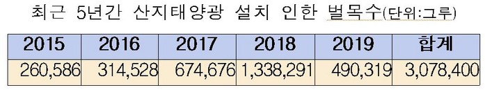 박근혜 정부가 무분별하게 산지태양광 인센티브를 강화해 본격적인 산림훼손이 시작된지 2년만의 일이다. 이로 인해 2017년 67만 건, ’18년 133만 건에 달했던 벌목수는 ’19년 49만 건으로 대폭 감소했다.