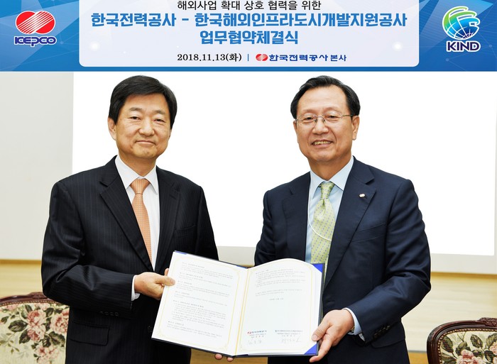 [환경데일리 최인배 기자]KEPCO, 한국전력(대표이사 사장 김종갑)은 한국해외인프라도시개발지원공사(KIND, 사장 허경구)와 13일 한전 본사에서 '해외사업 확대와 한국 건설회사 EPC동반 진출을 위한 업무협약'을 체결했다.