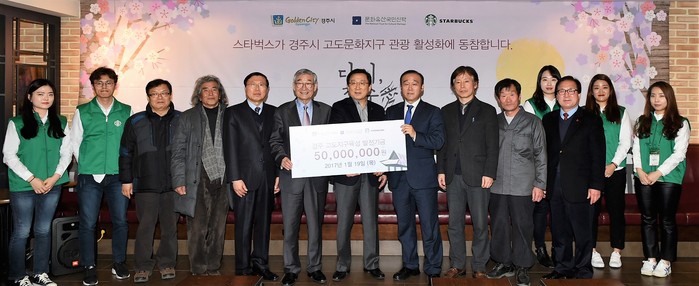 스타벅스코리아는 지난 해 지진과 태풍 등으로 피해를 입은 경주의 문화재와 고도지구에 작은 보탬이 되고자, 지난 해 10월부터 12월까지의 경주시티머그컵과 텀블러 판매 수익금 5000만원 전액을 기탁했다.