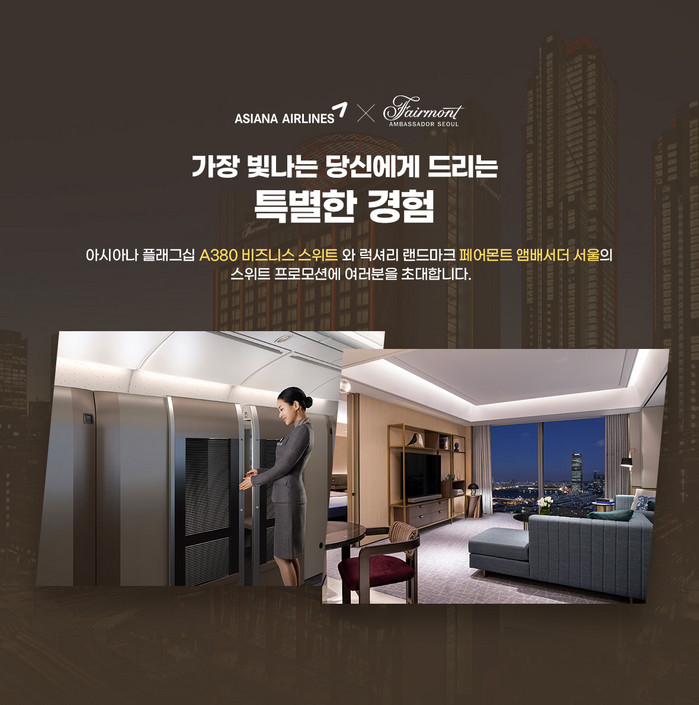 [환경데일리 고용철 기자]아시아나항공이 1일. 글로벌 럭셔리 호텔인 페어몬트 앰배서더 서울과 손잡고 공동 프로모션을 진행한다. 아시아나 X 페어몬트 앰배서더 서울 스위트 프로모션은 1일부터 12월 31일까지다.