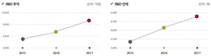 | ▲LG화학의 그린본드 발행으로 시너지 효과는 R&D 기술개발과 인력 확충이다. 매년 18% 이상 투자해온 점을 감안하면 향후 5년내 지금보다 25%이상 투자는 지속적으로 이어질 것으로 내다보인다. |