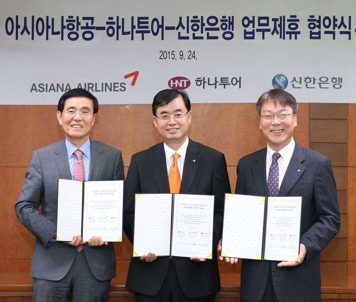 24일 서울시 중구 소재 신한은행 본점 6층 회의실에서 개최된 아시아나항공-하나투어-신한은행 업무제휴 협약식에서 (아래 사진 왼쪽부터) 하나투어 이장연 전무이사, 아시아나항공 두성국 상무, 신한은행 박호기 본부장이 기념촬영을 하고 있다.