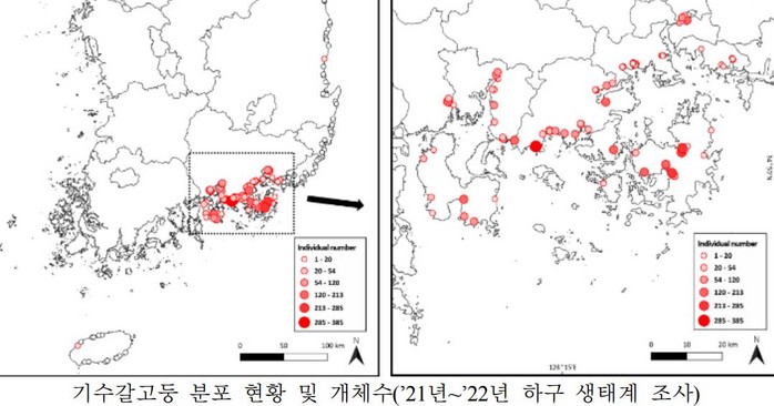 이번 하구 생태계 조사에서도 강원도 동해시부터 제주도까지 서식이 확인됐다. 특히, 창원시부터 하동군에 걸쳐 경상남도 남해안권역에 위치한 하구습지에 집중적으로 분포하는 것으로 나타났다.