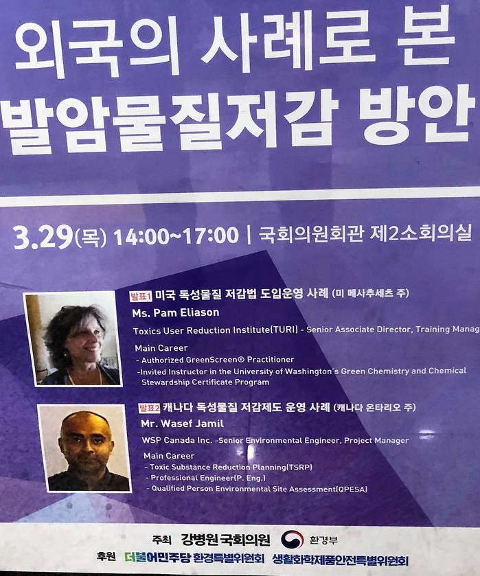 이번 심포지엄을 위해 미 매사추세츠주 독성물질저감법 연구기관 튜리(TURI)의 수석연구원 팸 엘리아슨(Pam Eliason), 캐나다 온타리오주 독성물질저감제도 컨설팅기관(WSP Canada Inc.)의 수석환경컨설턴트 와세프 자밀(Wasef Jamil)이 참석해 해외 제도운영 사례를 소개할 예정이다.