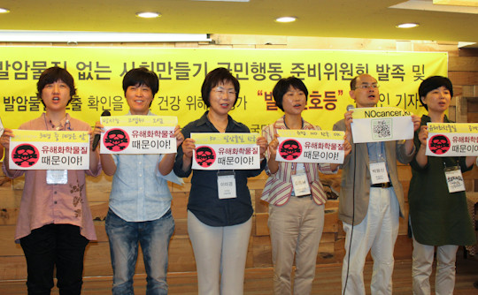 ▲발암물질 없는 사회 만들기 국민행동 준비위원회 발족식이 2011년 6월 부문별 대표들이 손펼침막을 들어 보이며 화학물질로부터 안전한 사회만들기를 호소했다. |