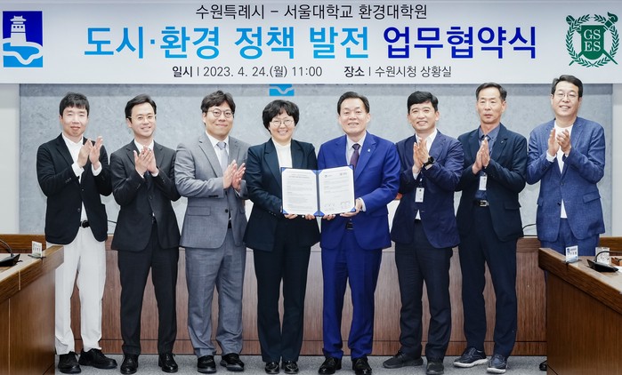 24일 수원시와 서울대 환경대학원은 시청에서 '도시·환경 정책 발전 업무협약'을 체결하고, 협력을 약속했다. 양측은 도시·환경 정책 발전을 위한 장기비전 수립, 공동연구에 협력하고, 국가연구과제를 수행할 때 수원시를 테스트 베드(시험대)로 활용하기로 했다.