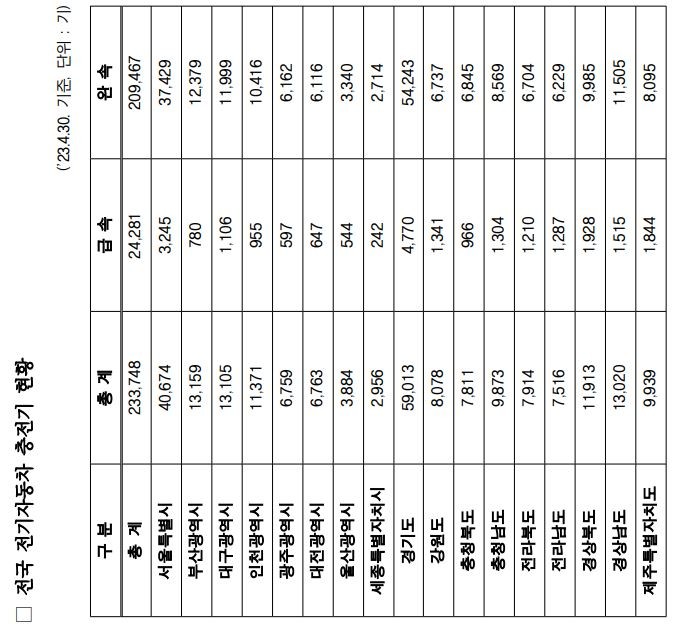 환경부가 소병훈 의원실에 제출한 '전국 전기차 충전기 현황'자료에 따르면, 전국 전기차 충전기는 23.3만대로 이중 급속 충전기는 2.4만대, 완속 충전기는 20.9만대였다.