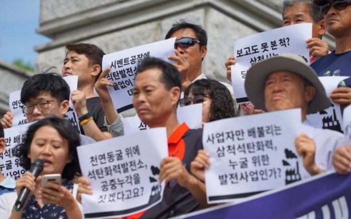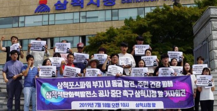 18일 오전 10시 삼척시청 앞에서 삼척석탄화력발전소반대투쟁위원회, 기후솔루션, 그린피스, 기후결의, 기후소송단, 녹색연합, 녹색법률센터 소속 활동가와 회원, 삼척시민 30명이 기자회견을 통해 삼척포스파워석탄화력발전소 동굴 발견에 따른 정밀조사 기간동안 전면 공사중단해야 마땅하고 이와 함께 사업에 따른 중대한 오류가 있다는 점에서 전면 재검토해야 한다고 촉구했다.