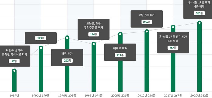 Ⅰ급 68종, Ⅱ급 214종으로 구성. Ⅰ급 1종(뿔제비갈매기), Ⅱ급 18종(홍줄나비 등)이 새로 추가됐고, 느시 등 9종은 등급이 변경되고 백조어 등 4종은 등급이 해제된다.