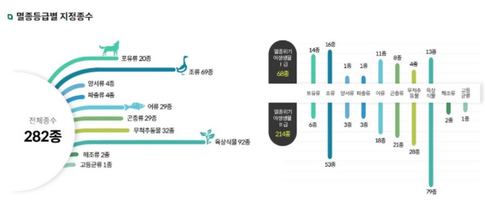 환경부 산하 국립생태원은 '야생생물 보호 및 관리법 시행규칙 개정(2022년 12월 9일)'으로 확정된 우리나라 '멸종위기 야생생물 282종'에 대한 정보를 누구나 쉽게 알 수 있도록 통계자료집, 도감, 포스터로 제작해 8월 30일부터 학교, 관공서, 연구기관 등에 배포한다고 밝혔다.