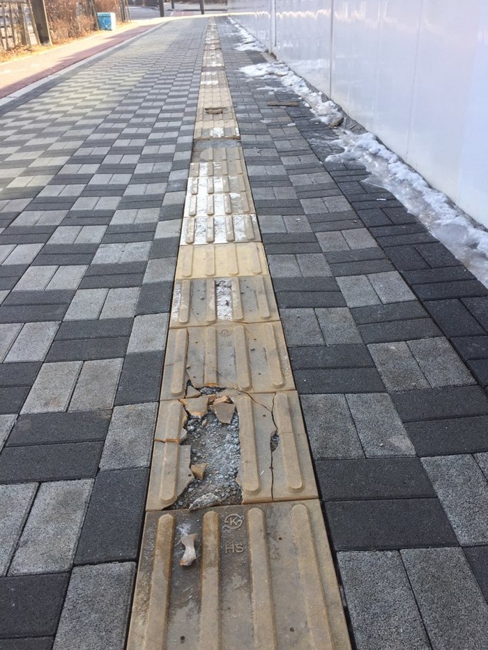 대부분의 장애인 전용 블록들이 겨울철이 지나면 부식이 되거나 파손 등이 잦아서 많이 훼손된 채 방치되는 곳이 많다.