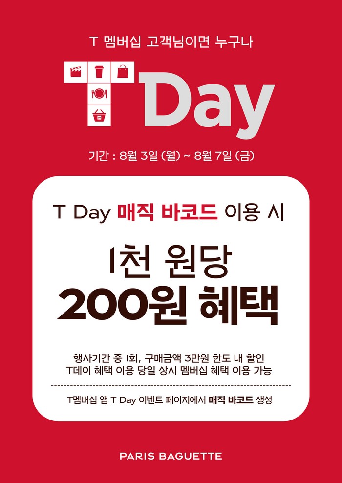 소비자는 T멤버십 앱 내의 'T-데이 프로모션' 이벤트 페이지에서 ‘매직 바코드’를 생성하고, 파리바게뜨 매장에서 결제 시 해당 바코드를 제시하면 1000원당 200원의 혜택을 받을 수 있다.