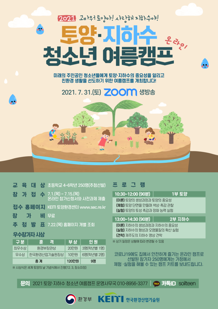 올해로 7번째인 '토양 지하수 청소년 여름캠프'는 탄소 저장고 역할을 하는 토양과 지하수의 중요성을 미래 세대에게 알려주는 교육 과정으로, 참가대상은 초등학교 4~6학년 학생(11~13세의 학교 밖 청소년 가능)이다.