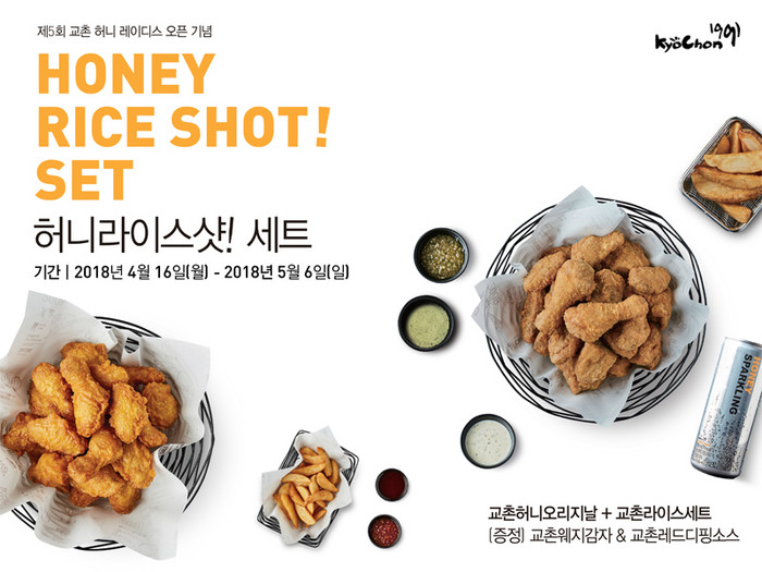 이번에 출시되는 '허니라이스샷!' 세트는 교촌허니오리지날과 교촌라이스세트로 구성돼 있으며, 레드디핑소스와 웨지감자가 추가로 증정된다.