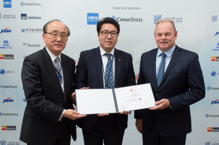 ▲포항제철소 제강부 김용태 과장(가운데)이 세계철강협회 교육분과위원장인 카키기(Kakigi) JFE Holdings 사장(왼쪽)과 요한피터 (Johannpeter) 세계철강협회장(브라질 게르다우(Gerdau)社 부회장)으로부터 상장을 받고 기념촬영을 하고 있다. |