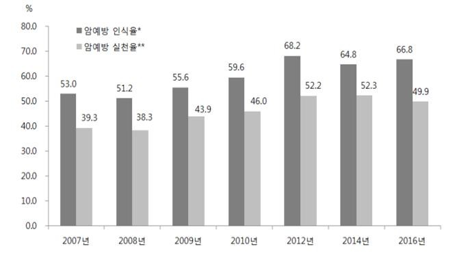 국민암예방수칙 인지도 2007년 45.6%서 2016년 68.5%까지