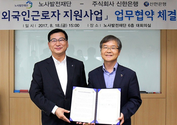 | ▲18일 서울 마포구에 위치한 노사발전재단 대회의실에서 신한은행 고윤주 부행장(왼쪽)과 노사발전재단 이정식 사무총장이 외국인근로자 지원사업 협약식 후 기념 촬영을 하고 있다 |