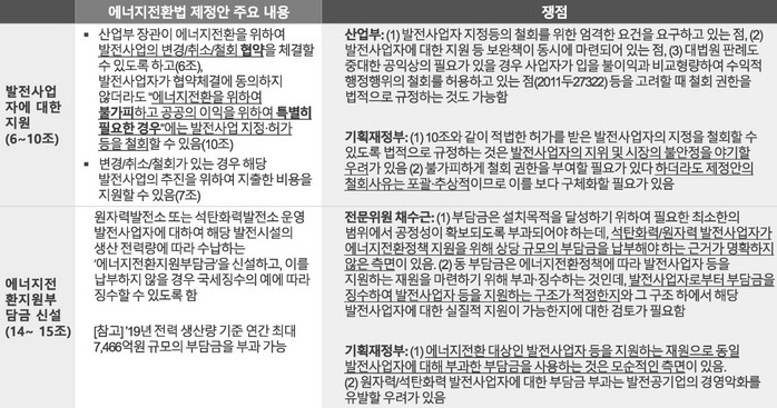 에너지전환지원부담금 신설 조항도 변수로 작동 될 수 있다는 지적이다. 기재부는 전환 대상인 발전사업자 등 지원한 재원으로 동일 발전사업자에게 부과한 부담금을 사용하는 건 모순이라며 강한 비판을 받을 수 있다고 지적했다.