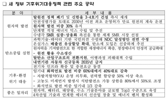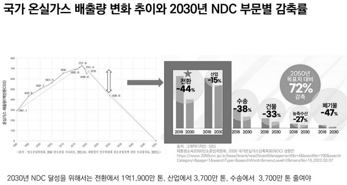 문 정부에서 출범한 탄소중립위원회는 윤 정부 인수위 보고를 통해 산업, 건물, 수송, 폐기물로 인해 꾸준히 늘어 탄소배출량과 기후위기의 두 마리 토끼를 잡기 위해서 늦어도 내년 3월까지 녹색성장 기본법 시행령은 마무리해야 한다.