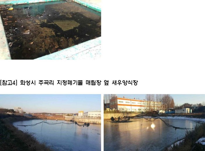 특히 "지정폐기물매립장 바로 옆, 침출수 유입이 우려되는 소형 저수지에서 최근까지 새우 양식장이 운영되고 있음을 확인했다."며 심각한 우려를 표했다. "저수지 옆 지정폐기물 매립장 내 폐건물에는 최근까지 사용된 다수의 농약병이 있었는데 양식장 운영과 관련 있어 보인다."며 관계당국의 조사가 필요하다고 언급했다.
