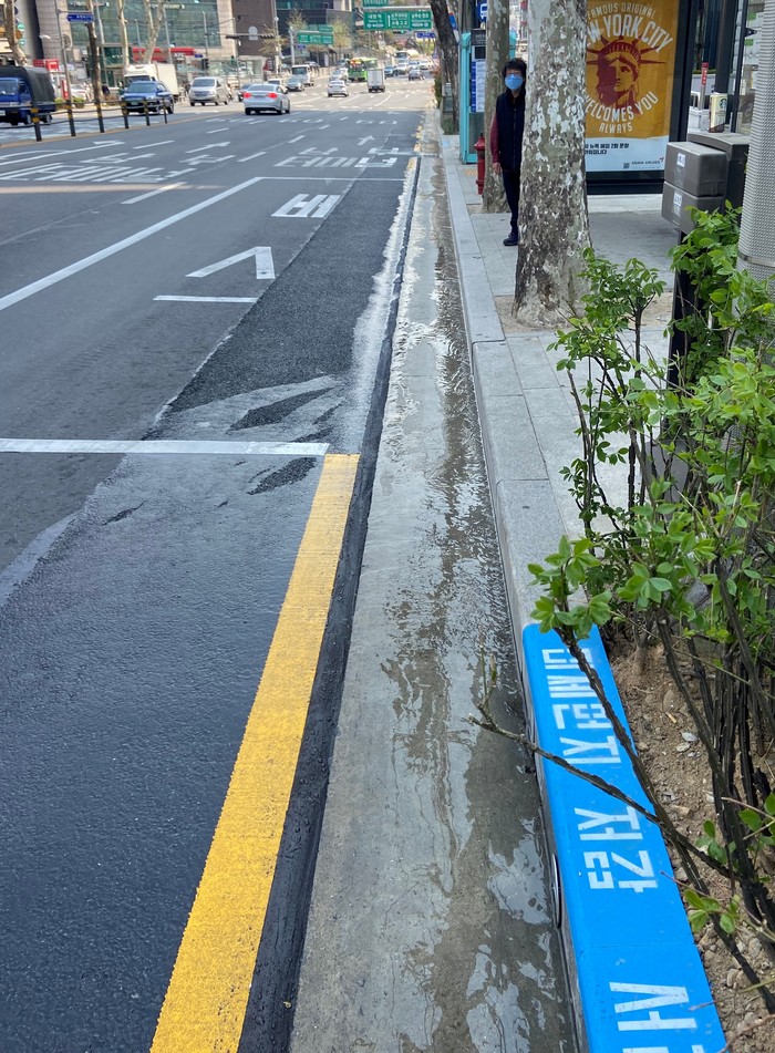 핵심은 보·차도경계석 측면부에 노즐을 설치 측구변에 물을 흘려보내는 자연유하방식으로 도로 측면의 미세먼지를 제거하고 도로 주변 온도를 저감하는 시설이다.