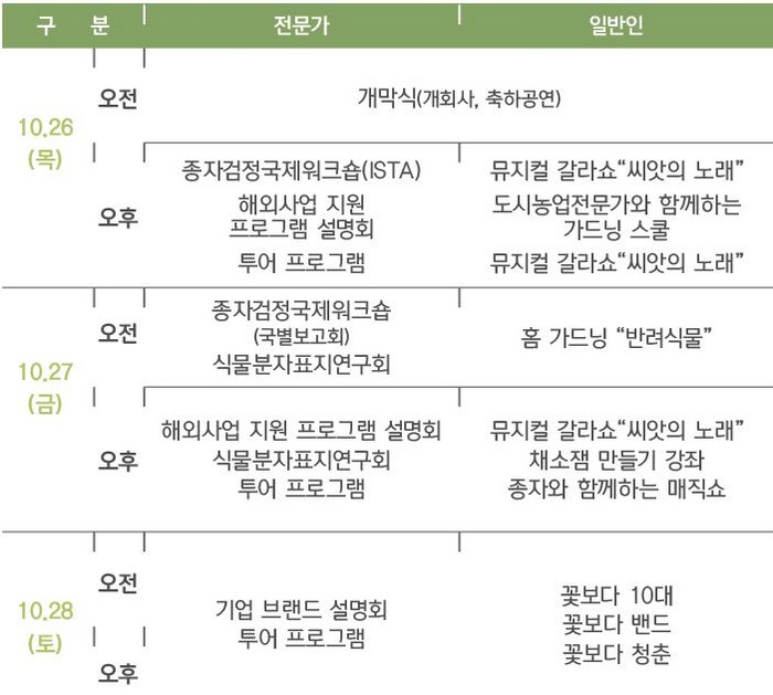 전시규모 행사장에 10만㎡(노지 전시포 3만㎡ 포함), 전시온실 1500㎡, 광장 2890㎡, 홍보 전시관 340㎡ 개폐회식, 학술대회, 비즈니스 데이전시·체험행사주제관, 산업관, 전시 온실, 농진청 전시포 및 홍보관 활용 부대행사품종 및 기술 설명회 등이 다채롭게 이뤄진다.