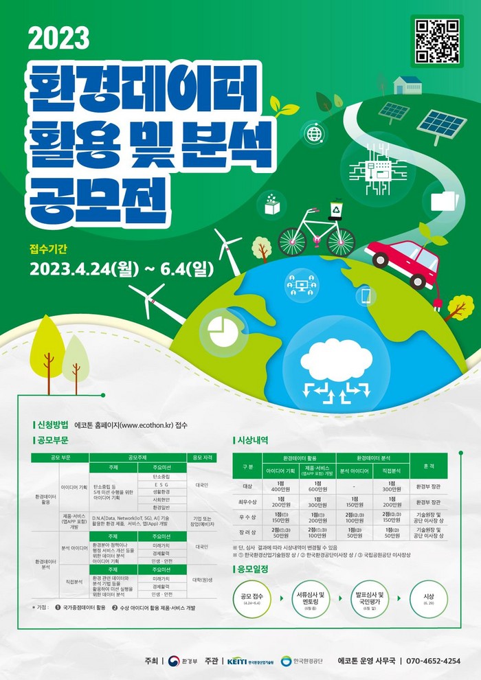 '2023 환경데이터 활용 및 분석 공모전'은 환경부, K-eco 한국환경공단과 KEITI 환경산업기술원이 주최하고, 국립공원공단, K-water 한국수자원공사가 후원해 공동 개최한다.