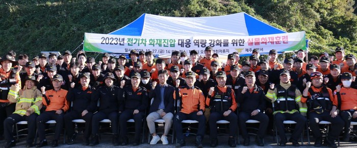 ▲제주특별자치도, 제주소방서는 제주도내 관광객 이용 전기차, 도민 전기차가 늘어남에 따라 화재사고를 신속하게 대응하기 위한 화재진압훈련을 강화하고 있다. |