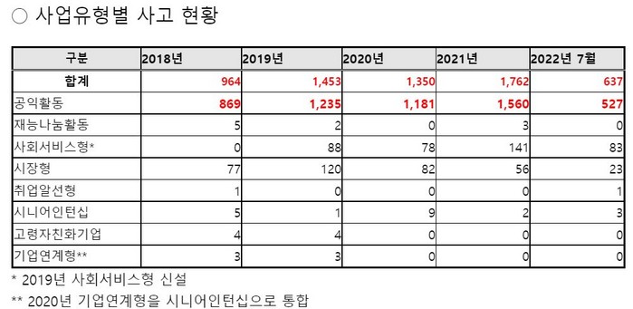 일자리유형별 사고건수는 ▲공익활동 일자리 5372건 ▲재능나눔활동 10건 ▲사회서비스형 390건 ▲시장형 일자리 358건 ▲취업알선형 2건 ▲시니어인턴십 20건 ▲고령자친화기업 8건 ▲기업연계형 6건으로 조사됐다.