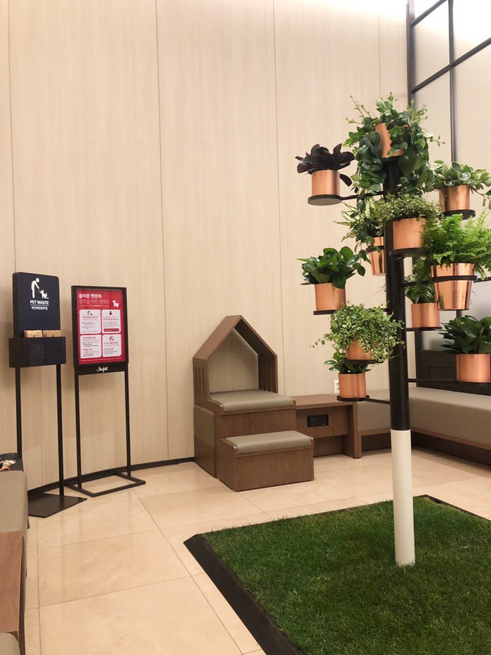 우선 비반려인과 반려견 동반 고객이 따로 편하게 쉴 수 있도록 불투명 유리벽을 활용해 공간을 분리시켜 각자 편하게 쉴 수 있도록 배려했다. 또 반려견이 쉴 수 있는 집 형태의 애견 전용 소파를 비롯해 반려견의 행동 패턴을 고려해 용변을 해결할 수 있는 천연잔디와 천연목재 기둥으로 구성된 반려견 전용 해우소도 설치했다.