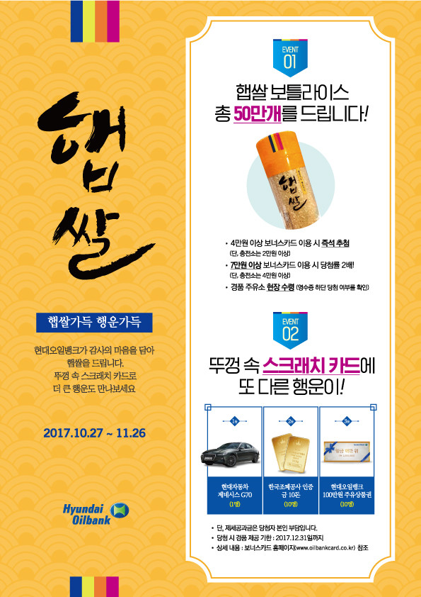 행사 기간 중 현대오일뱅크 주유소에서 4만원 이상(충전소는 2만 원) 주유한 보너스카드 고객이 대상이다. 결제 영수증에 당첨여부가 바로 인쇄되며 햅쌀도 현장에서 바로 수령할 수 있다.