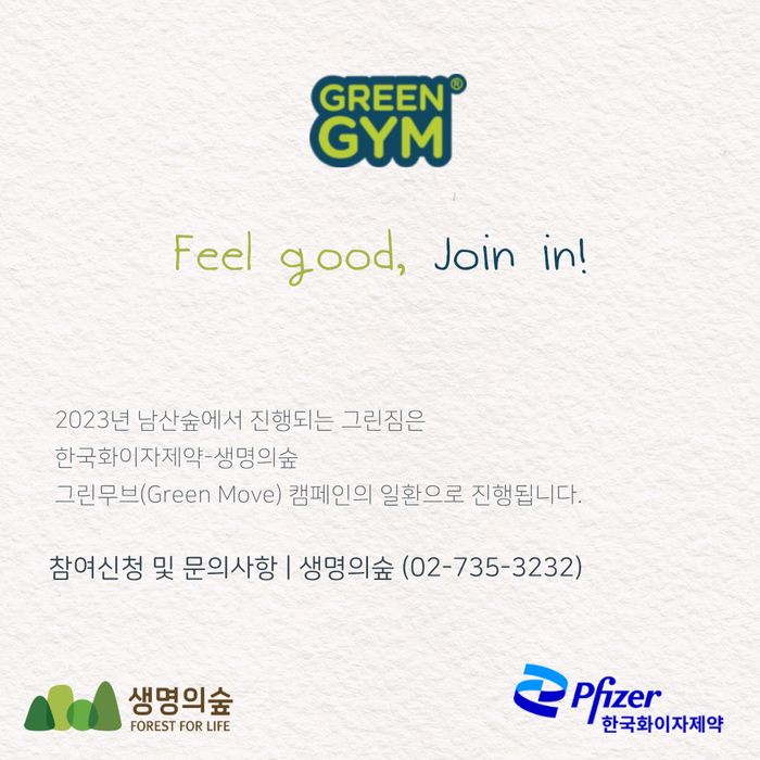 2023년 남산숲에서 진행되는 그린짐은 한국화이자제약-생명의숲 그린무브(Green Move) 캠페인의 일환으로 진행된다. 남산 그린짐은 한국화이자제약과 그린무브 캠페인 후원 기금으로 진행된다.