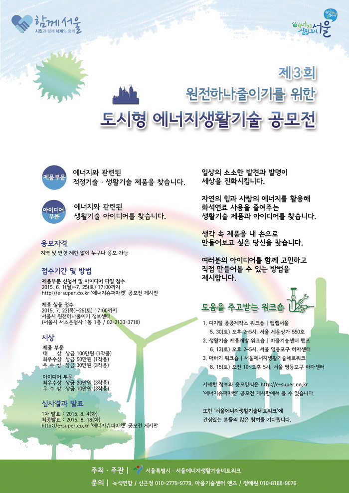 서울시는 7월 25일(토)까지 제3회 '원전하나줄이기를 위한 도시형 에너지생활기술 공모전'을 진행한다고 밝혔다. 에너지 자급률을 높이고, 비전력·신재생에너지 기술을 활용한 제품과 에너지절약 제품에 대한 시민의 관심 유도를 위해 개최되는 이번 제3회 '원전하나줄이기를 위한 도시형 에너지생활기술 공모전'은 7월 25일까지 참여가 가능하다.